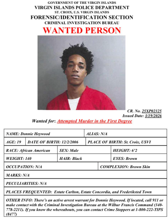 Authorities cautioned that the public should not approach Heywood if he is spotted. Instead, anyone with information is urged to call 911 immediately or contact the Criminal Investigation Bureau at the Wilbur Francis Command at (340) 778-2211.