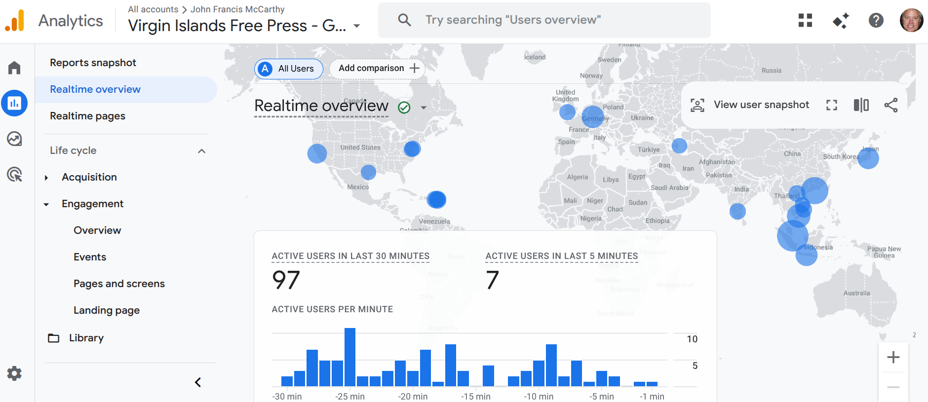 THE SMOKING GUN: Real-time analytics show the industrial scale of the raid, with traffic from Hanoi and Singapore out-pacing the local U.S. Virgin Islands audience. (Screen grab from Virgin Islands Free Press' Google site kit.)