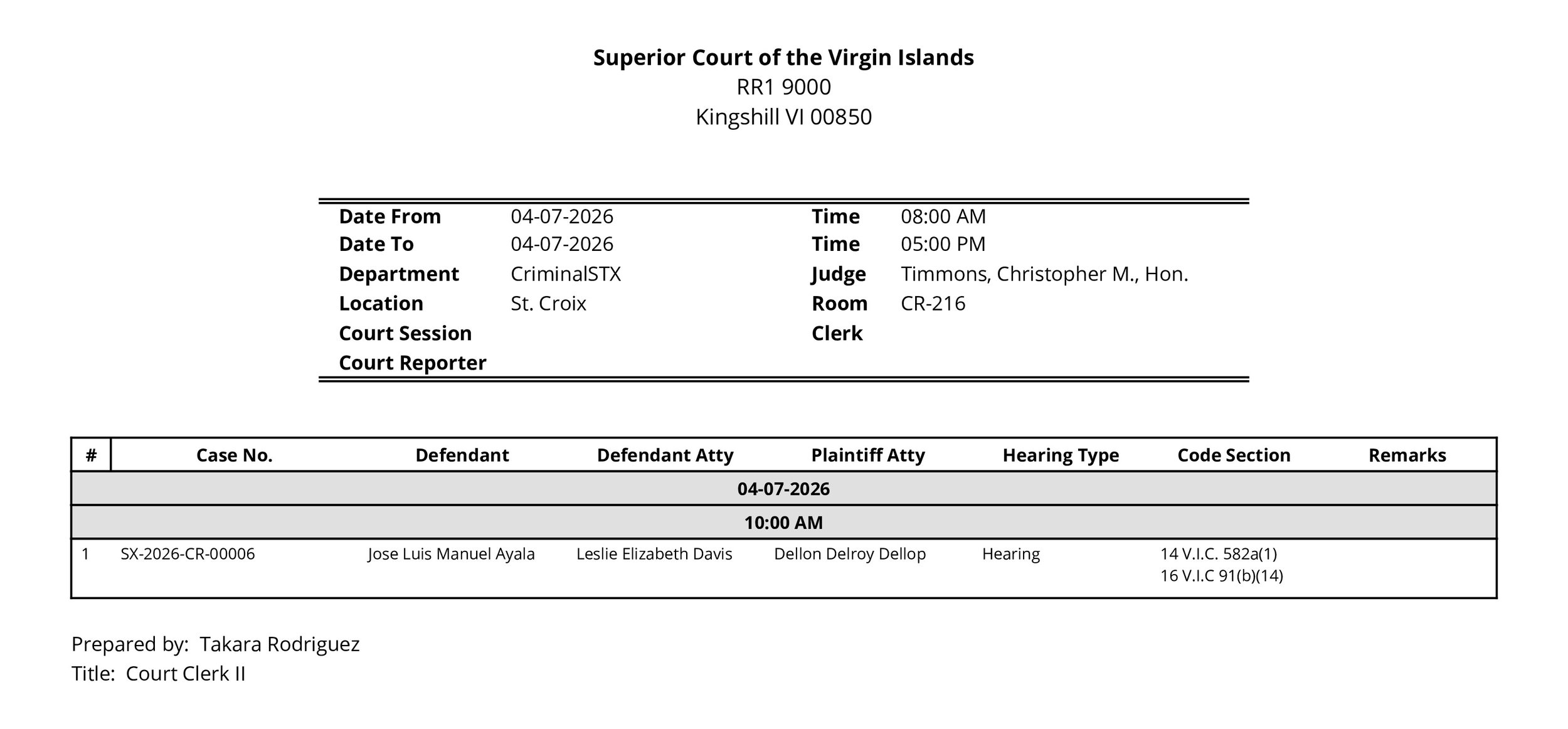 Jose Luis Manuel Ayala is appearing in Room CR-216 for a hearing related to case SX-2026-CR-00006. Ayala faces charges under 14 V.I.C. 582a(1) and 16 V.I.C 91(b)(14). He is represented by Leslie Elizabeth Davis, with Dellon Delroy Dellop prosecuting for the Virgin Islands.