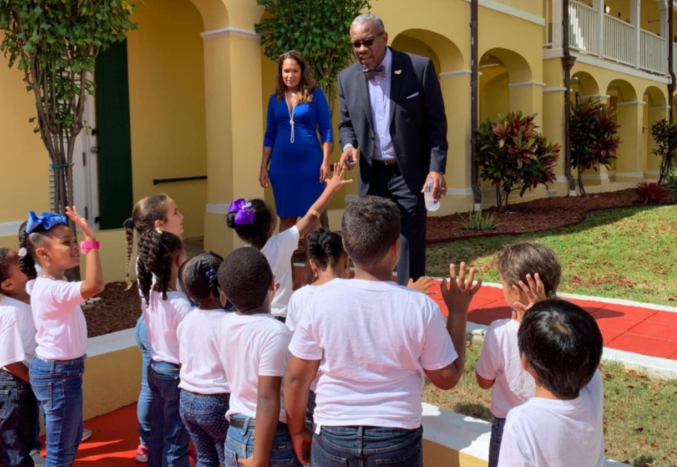 THE FAMILY MAN: Governor Albert Bryan Jr. and First Lady Yolanda Bryan pose with local children in the historic courtyard of Government House in Christiansted. This image, promoted by the Governor’s alma mater, Wittenberg University, depicts a leader focused on "momentum" and the future. However, as the 2026 "Cabinet Convict Collection" continues to grow, the public is left wondering if this polished image can survive the wreckage of a record-breaking term of federal indictments. (Photo: Wittenberg University/Government House)