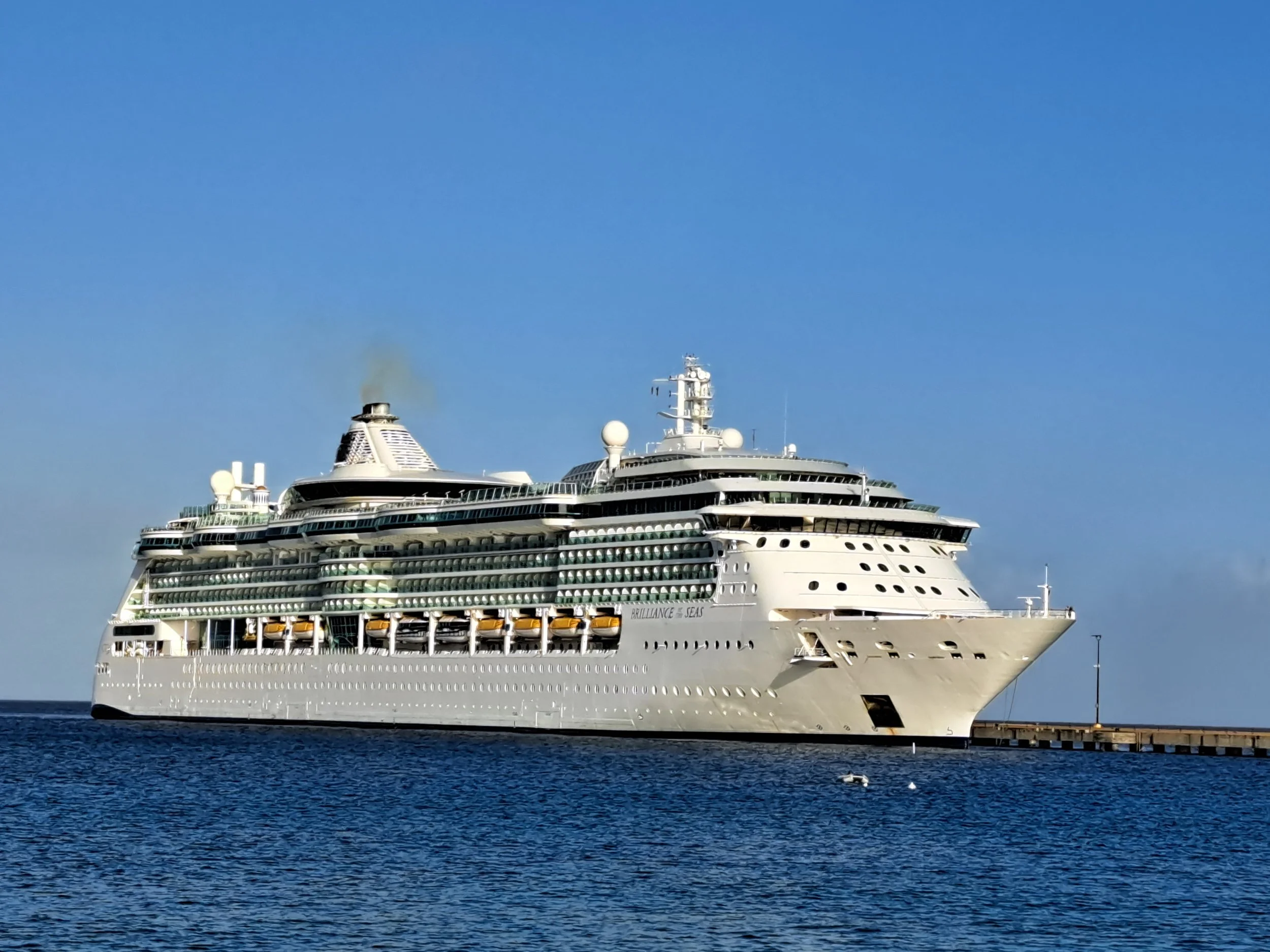 A SPECTACLE IN PORT: The Radiance-class Brilliance of the Seas sits majestically at the Ann E. Abramson Pier in Frederiksted today. Boasting a gross tonnage of 90,090 and a length of 962 feet, the vessel features over three acres of glass, including panoramic elevators that offer passengers sweeping views of the Caribbean. Onboard highlights for the 2,500+ guests include a 40-foot rock-climbing wall, a nine-story central atrium, and the signature 'Solarium'—an adults-only retreat under a retractable glass canopy. The ship is powered by eco-friendly gas turbines, a detail Elon Musk might appreciate even as the town’s basic infrastructure continues to struggle just yards away. (ST. CROIX SUN PHOTO BY JOHN MCCARTHY)