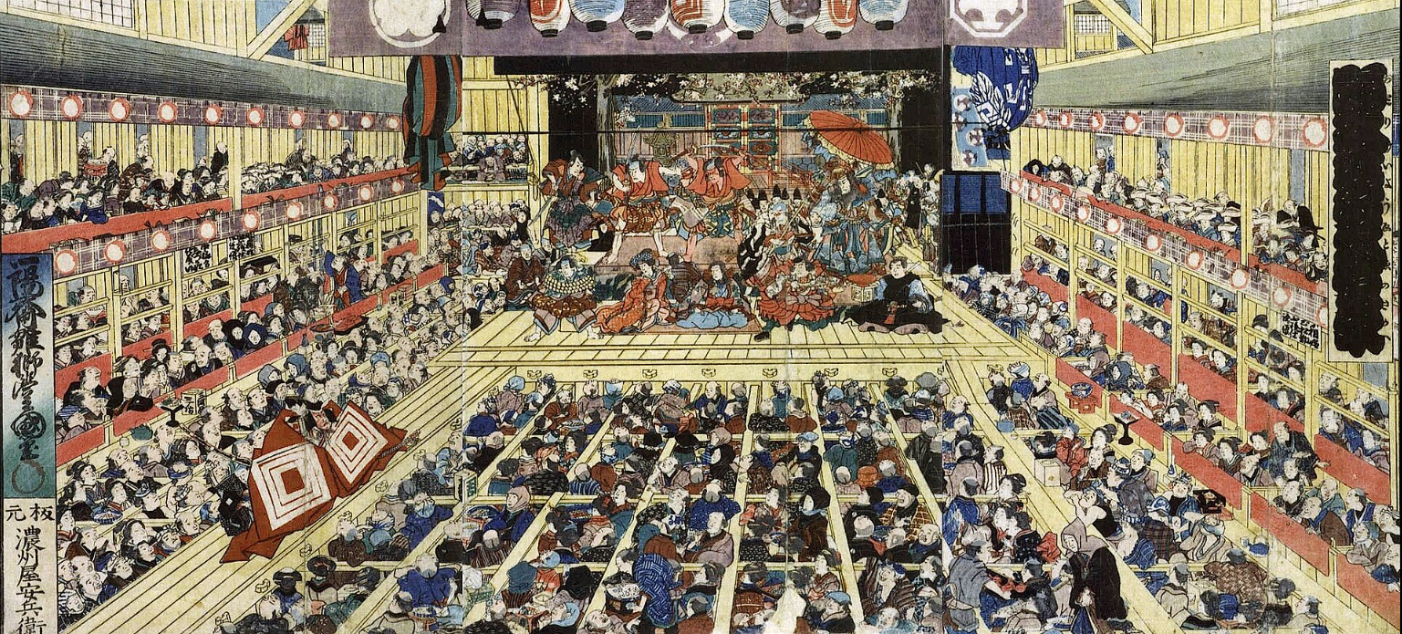The July 1858 production of Shibaraku at the Ichimura-za theater theatre in Edo. Triptych woodblock print by Utagawa Toyokuni III.