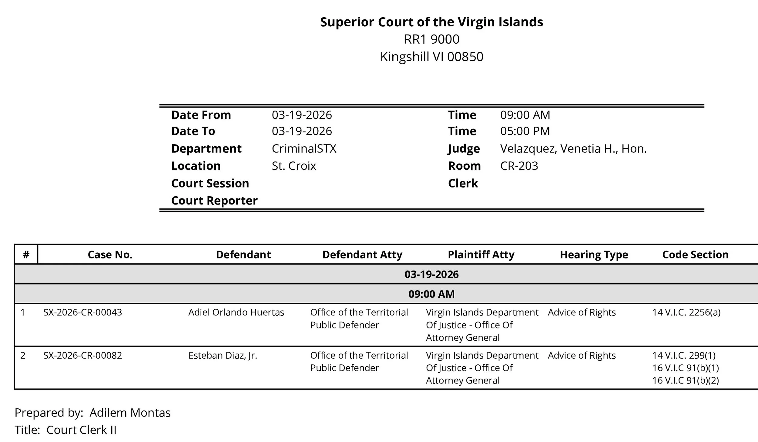 What to watch for: Look at the "Advice of Rights" phase. Judge Velazquez is particularly thorough when it comes to domestic cases. She often focuses heavily on the safety of the victim and the stability of the home environment. If there’s any history of previous "disturbing the peace" calls, expect a very strict set of release conditions that might include a "stay away" order from specific Christiansted neighborhoods.