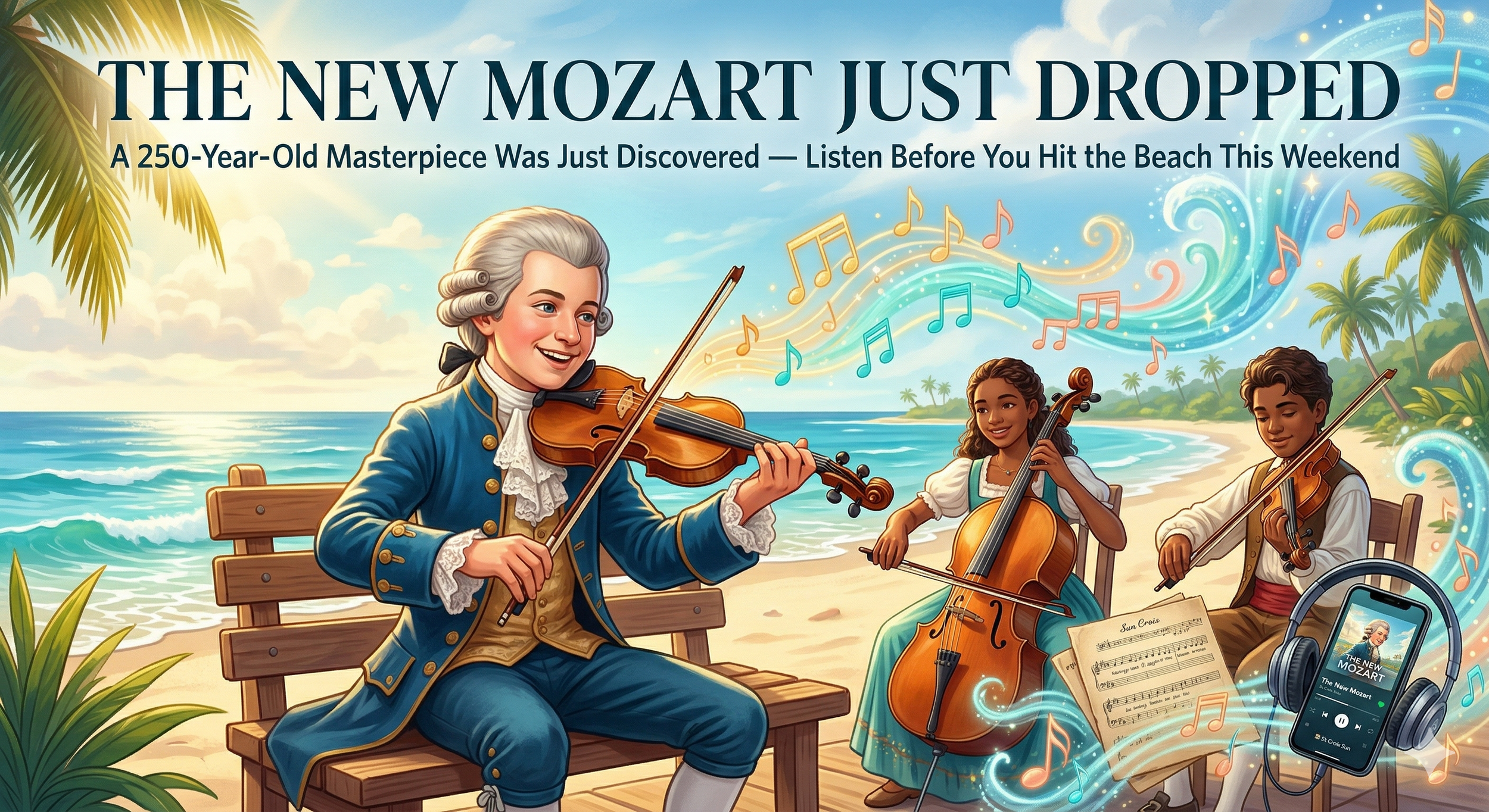 When history hits the playlist. 🎻🌴 Our vibrant digital illustration blends 18th-century mastery with modern relaxation. A teenage Wolfgang Amadeus Mozart joins local musicians for an impromptu beachside serenade, proving that mathematically perfect music is always in season. Put on your headphones and find out why this 250-year-old masterpiece just 'dropped'—it’s the ultimate palate cleanser. Read the full story on the St. Croix Sun. #TheNewMozart #USVI #StCroixSun #PalateCleanser"