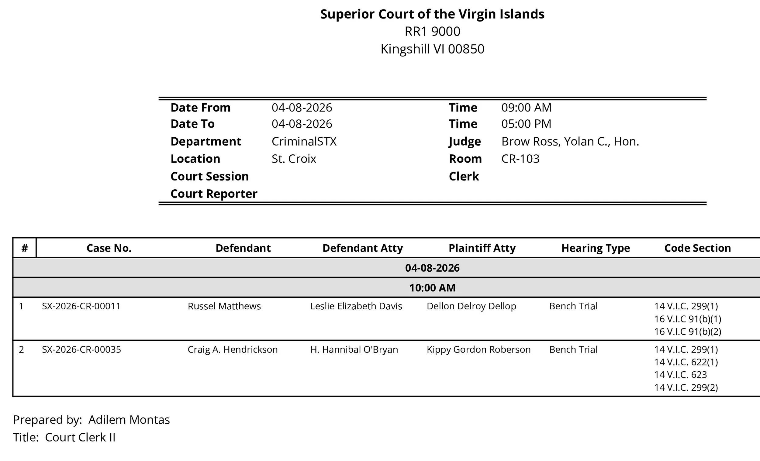 KINGSHILL — The morning air in Estate Kingshill was thick with more than just the humidity of April as the Superior Court of the Virgin Islands convened on Wednesday. The business before Magistrate Judge Yolan C. Brow Ross remained a sober reflection of the island’s domestic and civil pulse. In Room CR-103, the scales of justice were set to weigh the fates of two men, each facing a bench trial that would decide their immediate future under the territorial code.